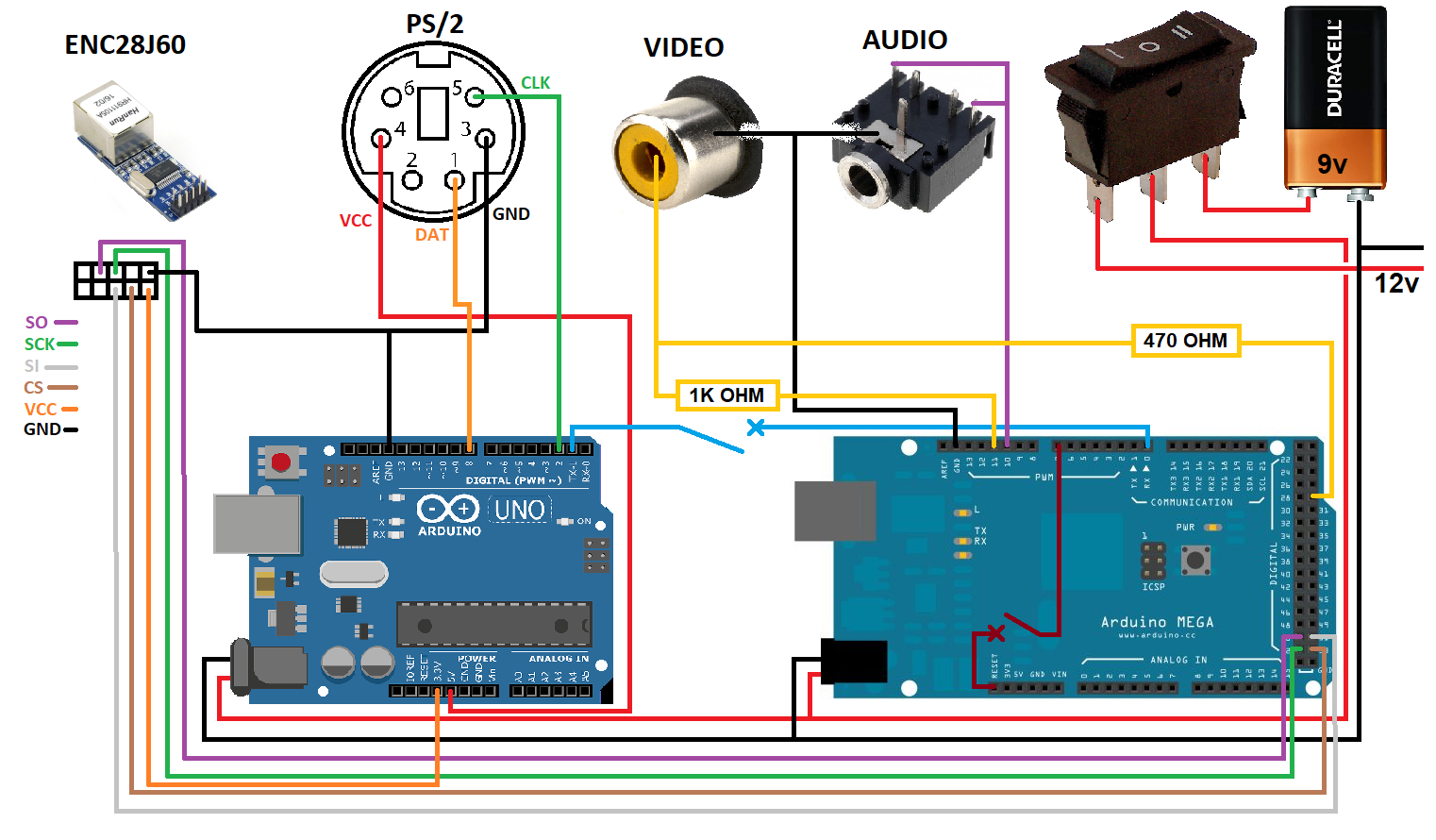 Początkowo nie planowałem robić takiego projektu, a jedynie chciałem pobawić się biblioteką TVout. Później korzystając z tego artykułu [LINK] podłączyłem klawiaturę i wpisywany tekst wyświetlał sie na ekranie. Naturalnym tego efektem było to, że chciałem aby płytka reagowała w jakiś sposób na wpisany tekst i ostatecznie napisałem mały system. Aktualnie można pisać na nim proste programy na takiej zasadzie jak odbywało się to na BASICu i dodałem jeszcze inne funkcje m.in. high i low do zarządzania napięciem na pinach płytki by zapalać diody. Projekt zakończył się na podłączeniu karty sieciowej, a jego następca powstaje na płytce NodeMCU v3.