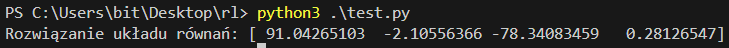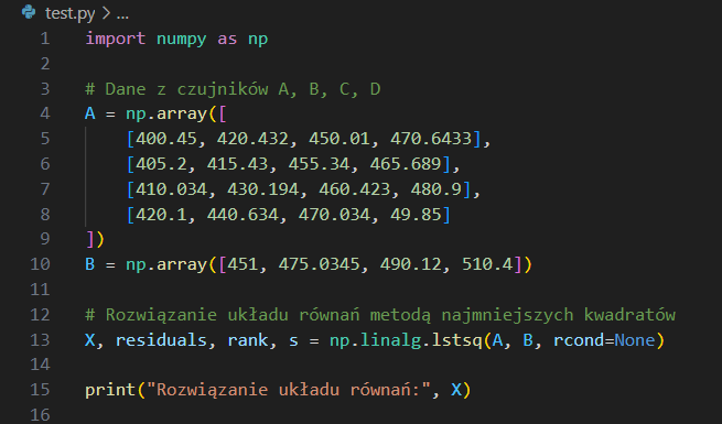 Rozwiązaniem układu będą współczynniki \(x_1, x_2, x_3, x_4\), które określają wpływ danych z każdego czujnika na przewidywaną wartość E.