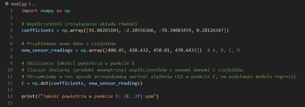 Dostaliśnmy cztery współczynniki które możemy wykrozystać do obliczania jakości powietrza w punkcie E na podstawie odczytów z punktów A, B, C oraz D.